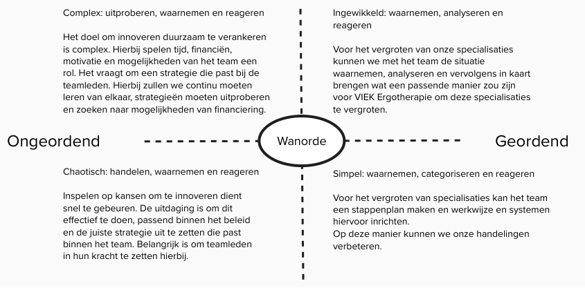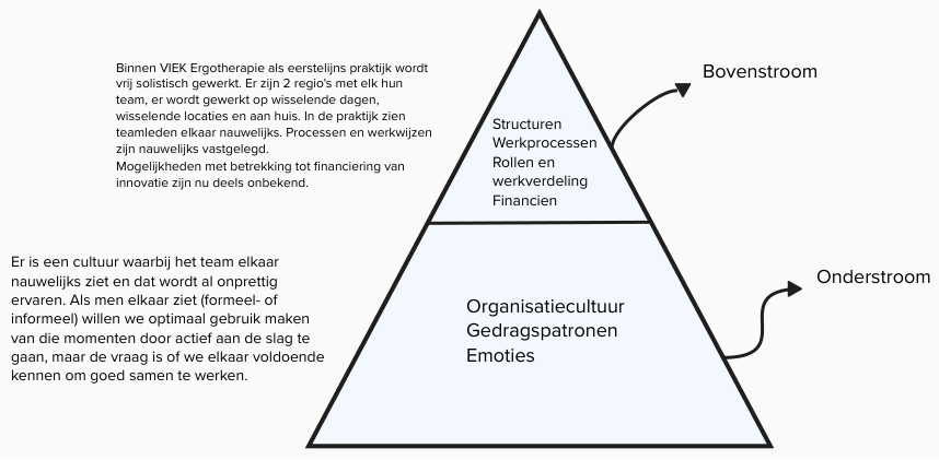 Met inzet van het Cynefin raamwerk (6, 7, 8) en het systeemdenken (10, 11, 12) is deze informatie vervolgens geanalyseerd. Het Cynefin raamwerk duidt de complexiteit van de situatie en het systeemdenken brengt de dynamiek van team VIEK in kaart en laat ons onderlinge interactie begrijpen. Daarbij is gekeken naar onderliggende, verborgen factoren (de zogenaamde onderstroom) en de bovenstroom.