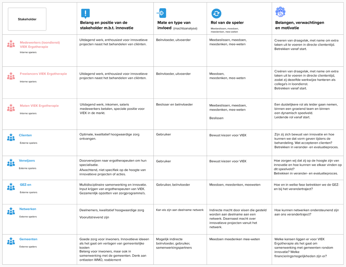 De interne spelers, team VIEK Ergotherapie, kunnen verdeeld worden in 3 groepen met verschillen in zeggenschap (macht) en belangen. De maten, de loondiensters en de freelancers. De externe spelers spelen een rol, maar hoeven in eerste instantie niet actief betrokken te worden in de veranderstrategie. Zij kunnen wel gebruikt worden om te evalueren en zo nodig de veranderstrategie bij te stellen.