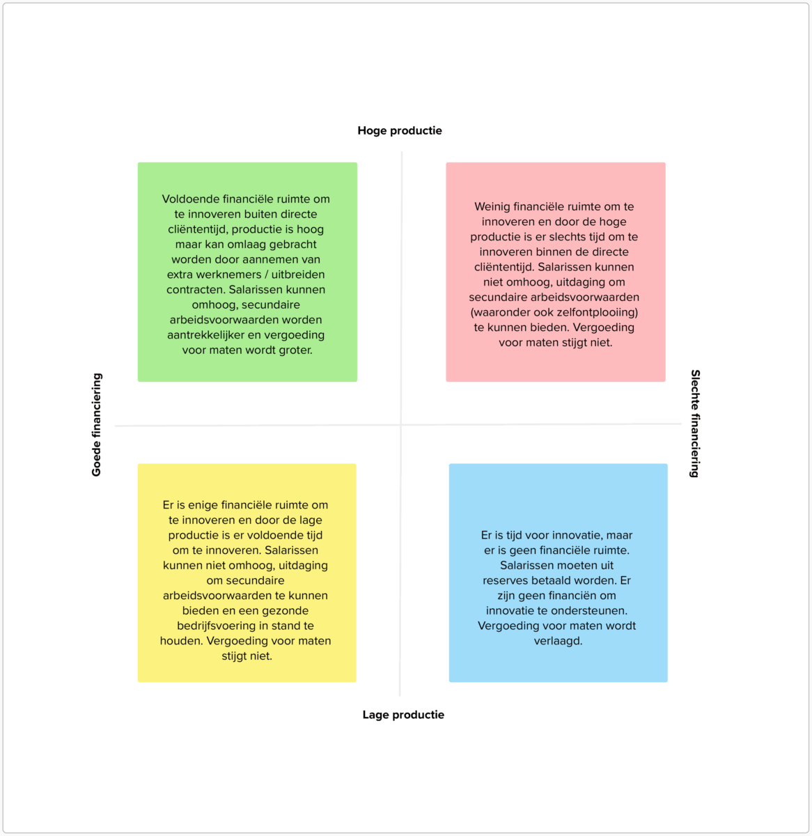 In het beschrijven van de scenario’s (1, 13) is uitgegaan van toekomstbeelden op basis van financiering en productie van ergotherapie en welke invloed dit heeft op tijd om te innoveren. Bij het meest gunstige scenario, een hoge productie en goede tarieven, is het meeste ruimte voor innovatie. Deze kan dan ook gedeeltelijk buiten directe cliëntentijd plaatsvinden. De verwachting, op basis van het verleden, is echter dat tarieven door de zorgverzekeraars onvoldoende meegroeien. Een hoge productie is dan extra belangrijk.