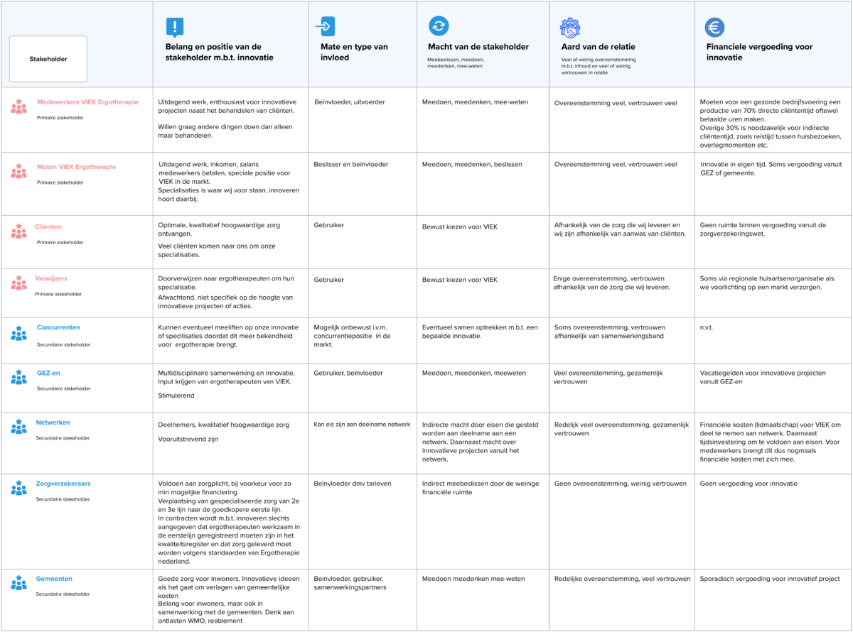 De stakeholderanalyse (1, 14) geeft weer dat werken aan innovatie van invloed is op behoud van werknemers, het ontvangen van nieuwe cliëntvragen en het blijven deelnemen aan netwerken. Op mesoniveau het bestaansrecht van ergotherapie: gezien en gehoord worden in regionaal beleid en vergoeding via het basispakket van de zorgverzekeringswet behouden.