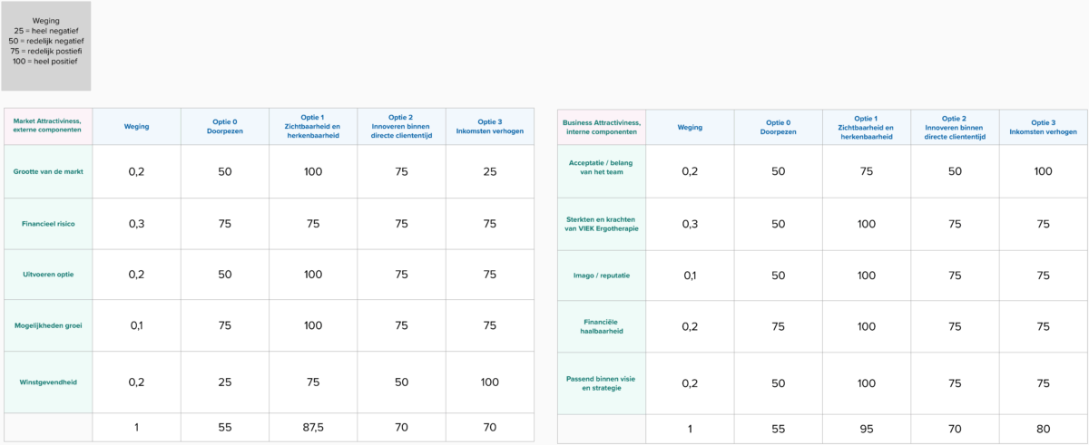 Met behulp van de MaBa analyse (1, 9 en 11) worden de strategische opties gewogen aan de hand van zelf bepaalde wegingsfactoren waardoor de weging wordt toegespitst op normen en waarden van onze praktijk. Optie 1 scoort zowel op marktaantrekkelijkheid als op business aantrekkelijkheid het hoogste.