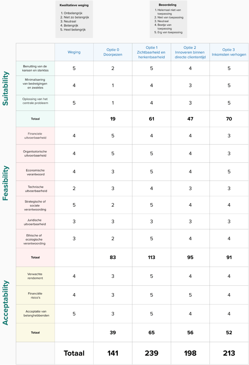 Met behulp van de SFA matrix van Johnson en Scholes (1, 7 en 12) worden de verschillende strategische opties zoals geformuleerd in stap 4 op een gestructureerde manier aan de hand van vaste wegingsfactoren beoordeeld. Opvallend is dat optie 3 ‘inkomsten verhogen’ het hoogste scoort op geschiktheid (suitability). Op haalbaarheid (feasibility) en aanvaardbaarheid (acceptability) scoort optie 1 ‘herkenbaarheid en zichtbaarheid’ het hoogste.